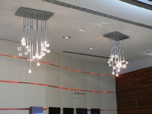edelstahl mit glaswürfel an swarovski gehänge, freistrahlende und punktuelle lichtquellen, 210w/12v incl.trafo